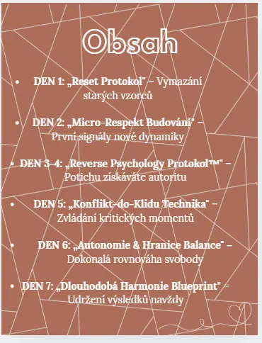 Za 7 dní můžete mít zpátky dítě, které s vámi mluví. Které vás respektuje. Domov, kde není válka. S metodou HarmonyPuberty™ – 15 minut denně, hotové denní plány, word-for-word skripty. Prostě následujete a výsledky přicházejí automaticky.